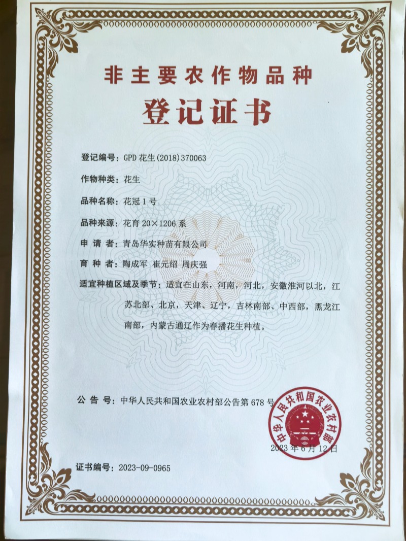 花冠1号登记证书